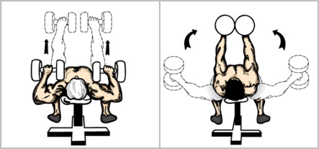 啞鈴臥推同樣是5下,和槓鈴臥推一樣都是在拚肌力的。緊接著練啞鈴飛鳥夾胸,以確保真正 耗掉並把中胸的肌肉給徹底拉開。飛鳥夾胸的重量就直接抓剛剛啞鈴臥推的一半重量,練到力竭為止,一般次數大概會落在8~12以內。若超過12下則表示剛剛 啞鈴臥推的重量不夠。看到這應該會想不是都練了槓鈴臥推了嗎,為何還要再加練啞鈴臥推?
